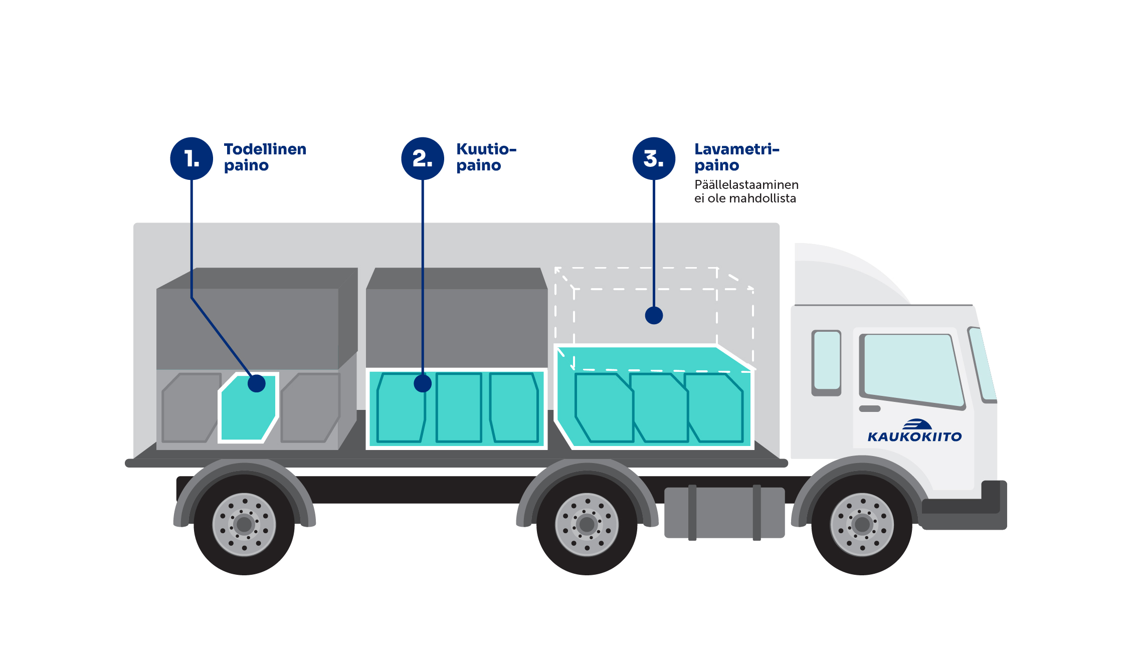 Lähetyksen rahdituspaino lasketaan sen tilavuuden, massan tai kuljetuksessa todellisuudessa käytetyn lava-/kuormatilan mukaan. Määrittelyssä huomioidaan myös lähetyksen tuenta ja liikenneturvallinen sijoittelu kuormatilassa.